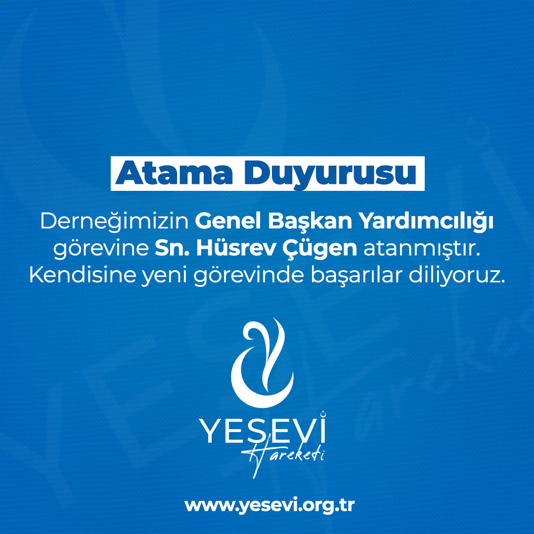 YESEVİ Hareketi olarak, Sn. Hüsrev Çügen’e yeni görevinde başarılar diliyor; bu atamanın derneğimiz ve camiamız için hayırlı olmasını temenni ediyoruz.
