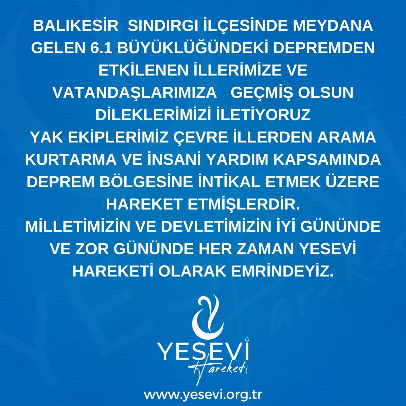 Milletimizin ve devletimizin hem iyi gününde hem de zor gününde, Yesevi Hareketi olarak her zaman göreve hazır olduğumuzu bir kez daha ifade ediyoruz.