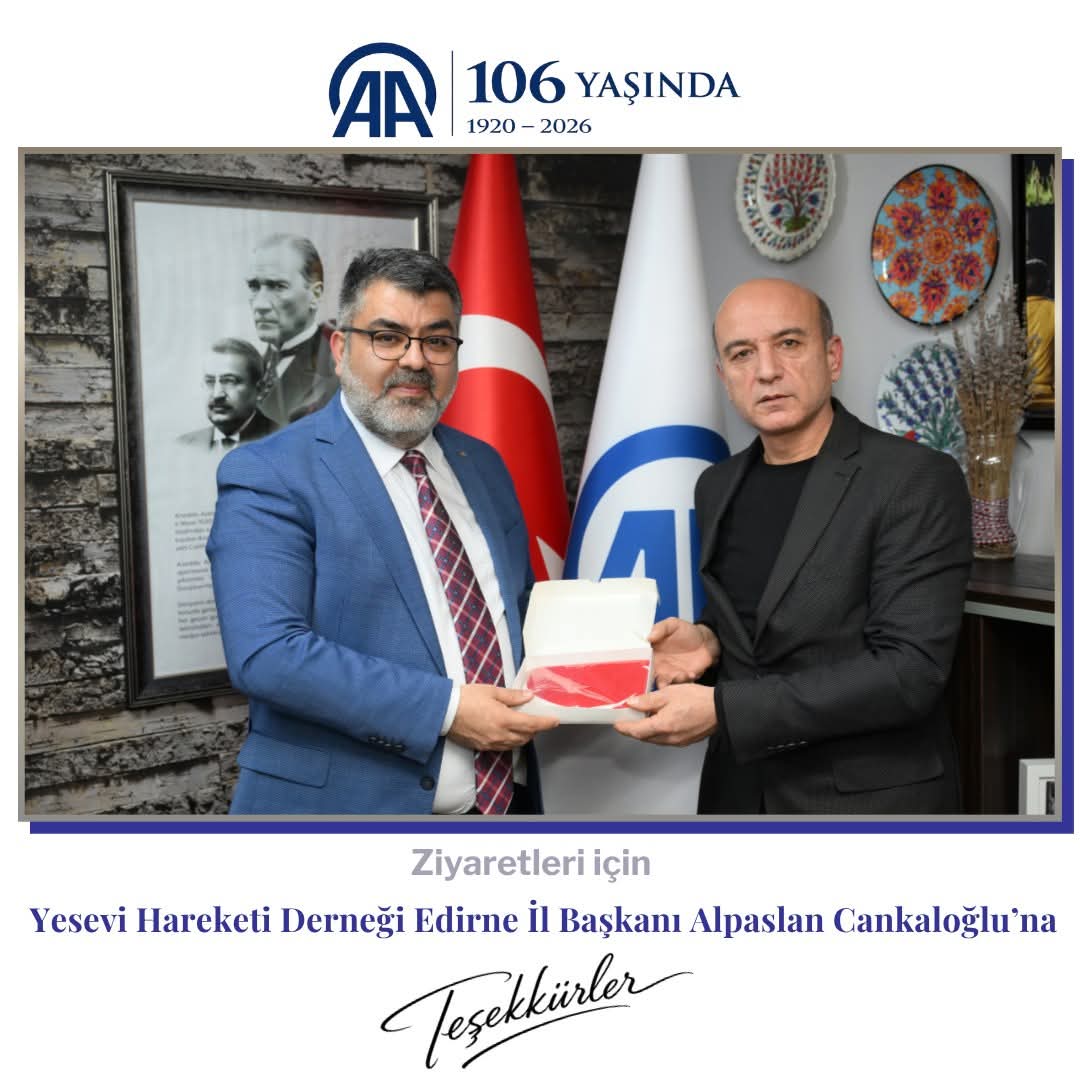 Yesevi Hareketi Derneği olarak; İl Başkanımız, Kadın Kolları Başkanımız, Sosyal Faaliyetler ve Halkla İlişkiler Birimi Başkanımız, Yardım Birimi Başkanımız, Spor Birimi Başkanımız, Engelliler Birimi Başkanımız ve Yesevi Arama Kurtarma (YAK) üyelerimizle birlikte, kuruluşunun 106. yıl dönümü münasebetiyle Anadolu Ajansı Edirne Trakya Bölge Müdürlüğü’nü ziyaret ettik.