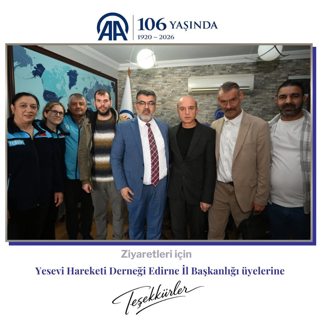 Yesevi Hareketi Derneği olarak; İl Başkanımız, Kadın Kolları Başkanımız, Sosyal Faaliyetler ve Halkla İlişkiler Birimi Başkanımız, Yardım Birimi Başkanımız, Spor Birimi Başkanımız, Engelliler Birimi Başkanımız ve Yesevi Arama Kurtarma (YAK) üyelerimizle birlikte, kuruluşunun 106. yıl dönümü münasebetiyle Anadolu Ajansı Edirne Trakya Bölge Müdürlüğü’nü ziyaret ettik.