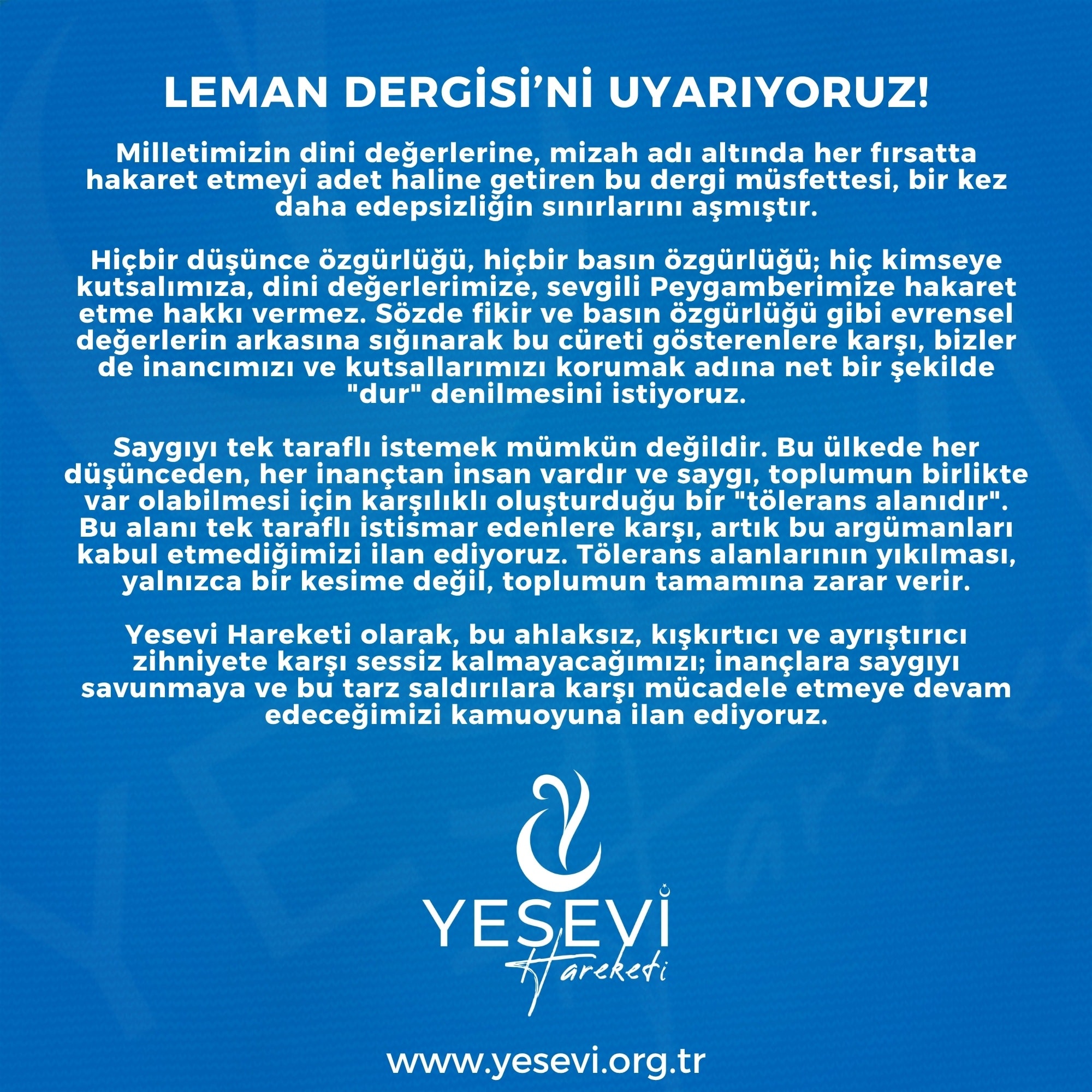 Yesevi Hareketi olarak, bu ahlaksız, kışkırtıcı ve ayrıştırıcı zihniyete karşı sessiz kalmayacağımızı; inançlara saygıyı savunmaya ve bu tarz saldırılara karşı mücadele etmeye devam edeceğimizi kamuoyuna ilan ediyoruz.