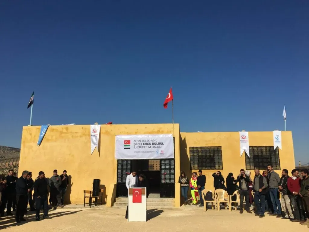 Bölgede ilk olarak Tekden Koleji işbirliği ile Afrin’e bağlı Meryemin kasabasında bulunan harabe halindeki okul binası yeniden tadil edilmiş, bina içinin tefrişatı ile eğitime kazandırılmıştır. Kasabada bulunan yaklaşık 1257 çocuğun sağlıklı bir eğitim almasına ortam hazırlamıştır.